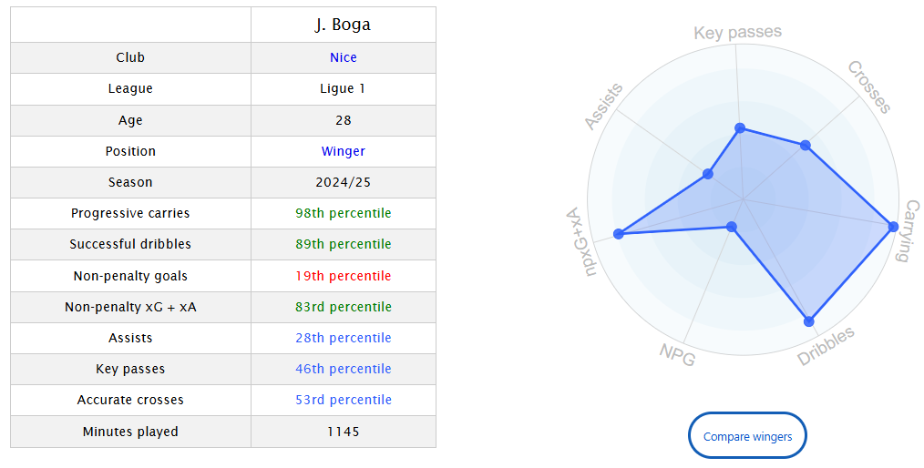 Boga is an interesting player – majority of his actions involve picking the ball up and dribbling past the opponent. He is not adept infront of goal, but he is very good at creating.