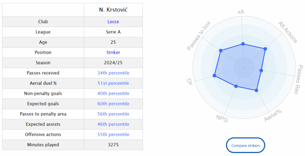 Nikola Krstovic has 18 goals in two Serie A seasons since joining Lecce. He has only played senior level football for just four seasons. Lecce signed him for just £3.45million and could get close to ten times that value for just two years of football.