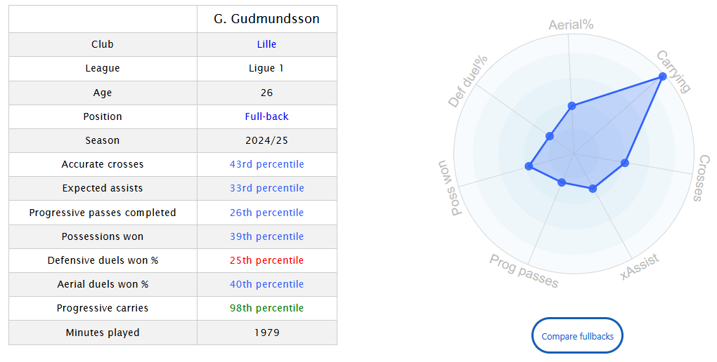 Gabriel Gudmundsson is much different from Firpo, he is a more possession-style fullback who can keep the ball and carry it. But his productivity is very low, which indicates that he plays a much different role at Lille.