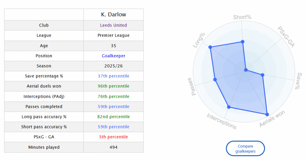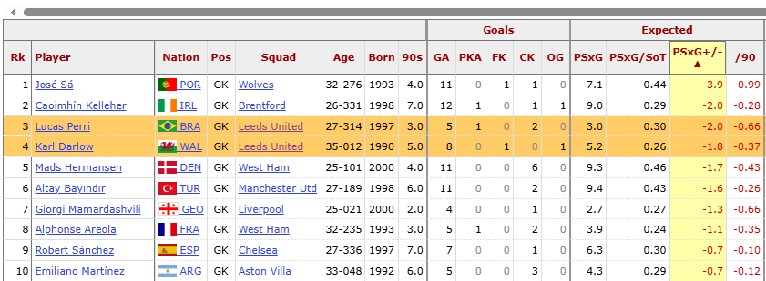But Perri came with his own issues; his distribution was very faulty in the first couple of games, leading to Gary Neville calling out Daniel Farke for having Leeds build out from the back. That was not the only issue; statistically Lucas Perri is one of the worst shot stoppers in the league after just 3 games. FBref statistic ‘Post Shot Expected goals minus Goals Allowed’ or PSxG+/- shows that the Brazilian is the third worst in the league.