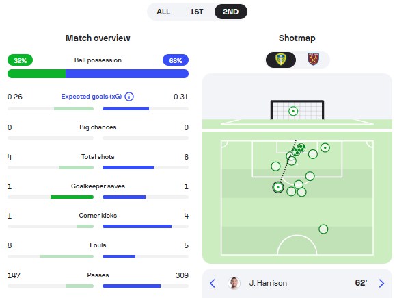 Farke has every reason to be disappointed – the second half performance was not the best. Leeds being good in one half and sloppy in the other has cost them recent games; including against Bournemouth. The Whites went from 51% possession, three big chances created and 1.23 expected goals to 0 big chances, 32% possession and 0.26 expected goals in the second half.
