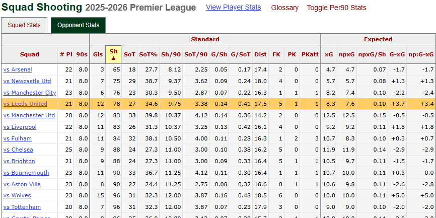 Which means the reason the club concede goals is not down to their setup; rather defensive lapses, set pieces and some poor goalkeeping. This fact is backed up even more with the numbers, when you find out that Leeds are among the teams to have conceded the least shots.