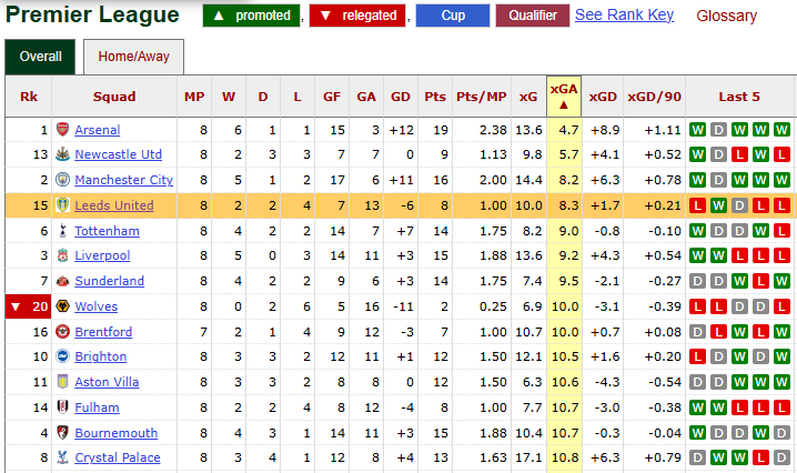Despite having conceded 13 goals and having one of the worst clean sheet records in the Premier League; statistically Leeds are a tough team to beat. The Whites are near the top of the table for expected goals against (xGA) with 8.3xGA just behind Arsenal, Newcastle United and Manchester City.