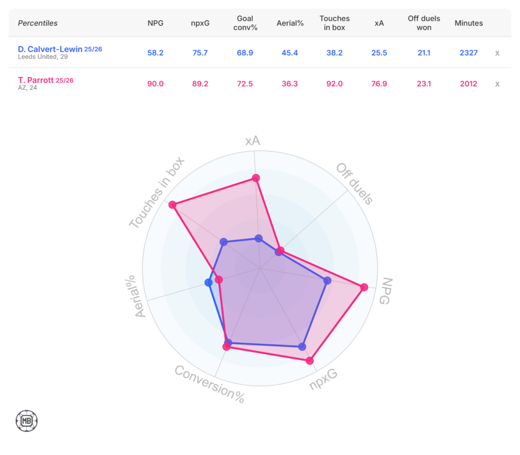 Both forwards are similar when it comes to their aerial ability and their ability to win offensive duels, however the data suggests that Parrott is far more creative than Calvert-Lewin.