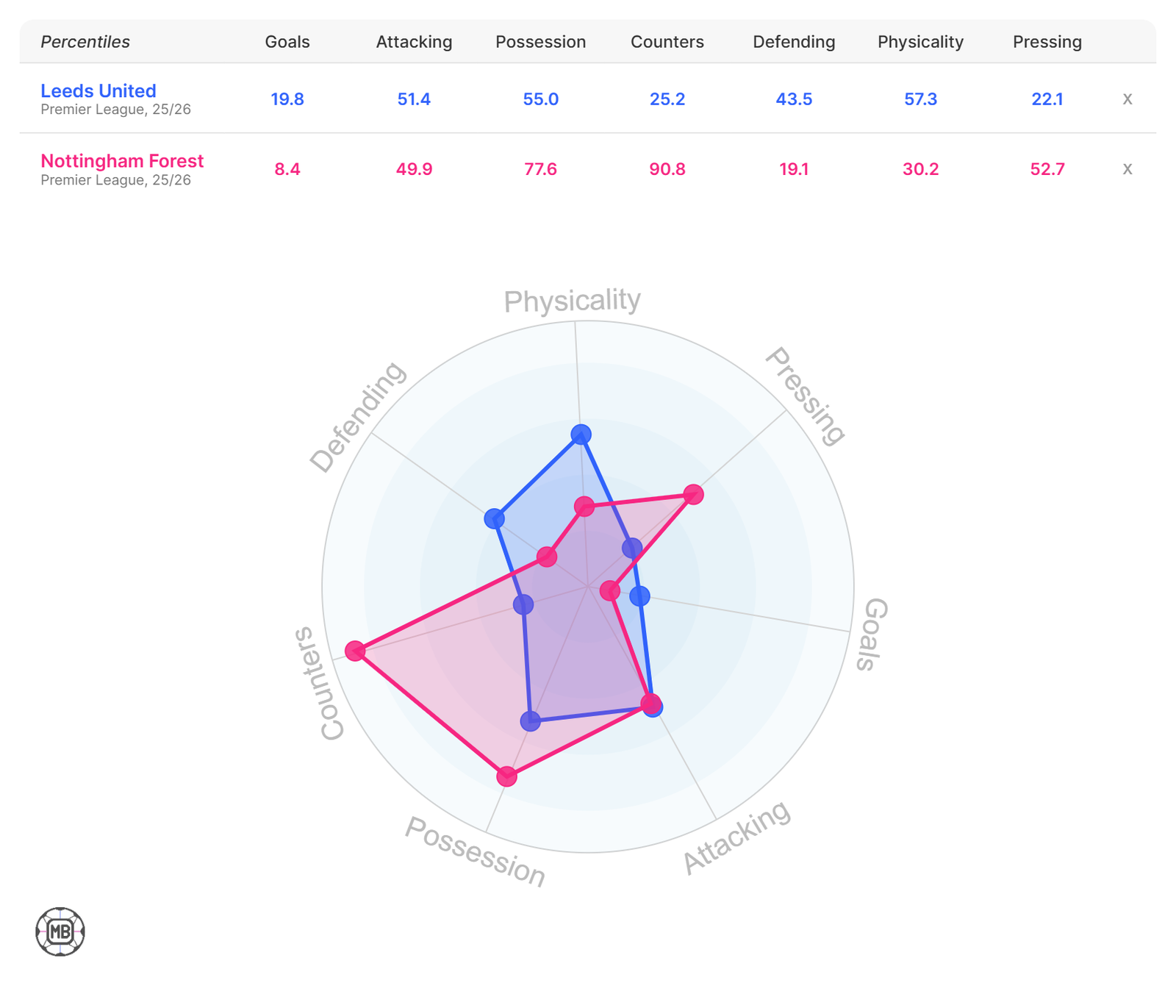 The instability is even visible in the data. While Leeds seem to have a consistent style, it is clear to point out that Forest have swung wildly between different footballing philosophies.