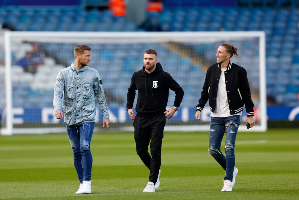 Liam Cooper, Stuart Dallas, and Luke Ayling. Credit: Imago Images