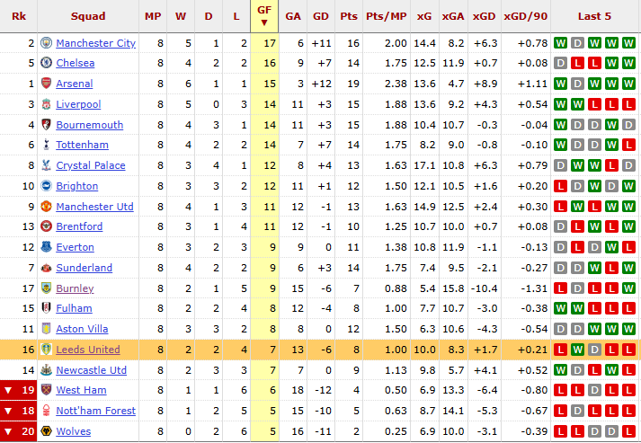 The biggest problem is that Leeds are not taking their chances, as they have created enough to score more than seven goals in their opening eight league games.