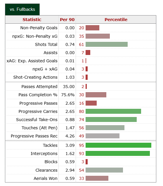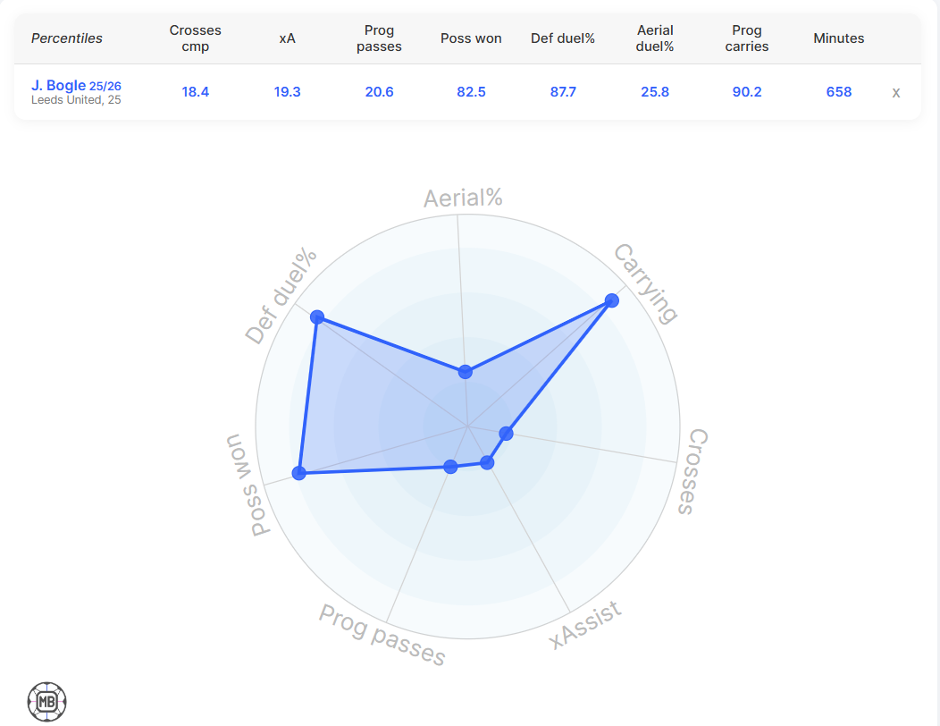 Bogle is playing a big part in winning the ball back for his team and has been winning most of his defensive duels. He has transitioned well into a more defensive than attacking right-back this season.