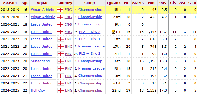 At this age, Joe Gelhardt needs to grab any opportunity at first team football. Hull were one of the only clubs to want to take a chance on the forward. He has shown flashes, with five goals in 19 games – which could raise interest this summer.