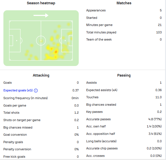 He has only played a total of 103 minutes and is yet to start a game for the club. The Winger’s numbers are not that impressive, which could see him struggle to break into the starting lineup when he eventually recovers from injury.