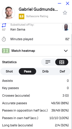 Svenska Fans gave Gudmundsson a 1/5 rating, stating how poor he started the game. Overall it was a very average game for the Leeds United man. He failed to complete a single cross or create a chance.