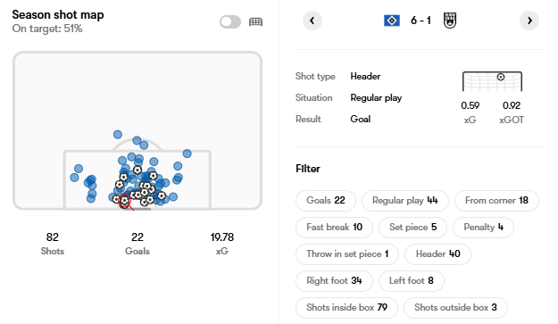 He lacks a bit of pace, but he makes up for it with his movement in the box – only three of his shot attempts were from outside the box. His heading ability is phenomenal, 11 out of his 22 goals came from the air. Leeds could benefit from this a lot in the Premier League.