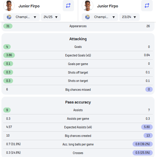 One of the decisions the club will have to make will involve Junior Firpo. With Leeds making the Premier League, this is a crucial time to evaluate the 28-year old’s future. Over the last two years, he has drastically changed the perception of him, putting in two solid seasons in the Championship. This is in stark contrast to the start of his career when he was struggling in the Premier League.