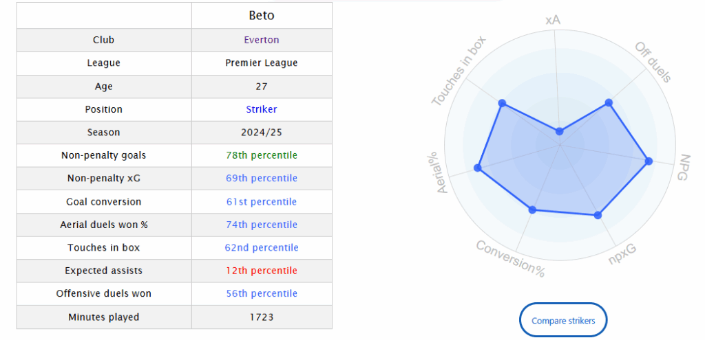 Beto is also great in the air, and a good finisher when the chance lands on his plate. He would do well in this Leeds United team under Daniel Farke.