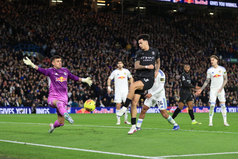 Manchester City winger Antoine Semenyo scored a late goal in a first half that was dominated by Leeds, who were all over the away side and should have taken the lead at home.