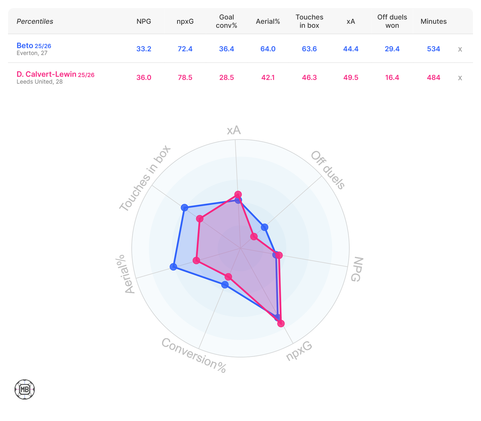 Beto is an even bigger aerial threat and touches the ball more in the opposition box than Calvert-Lewin while bringing the same level of physical threat.