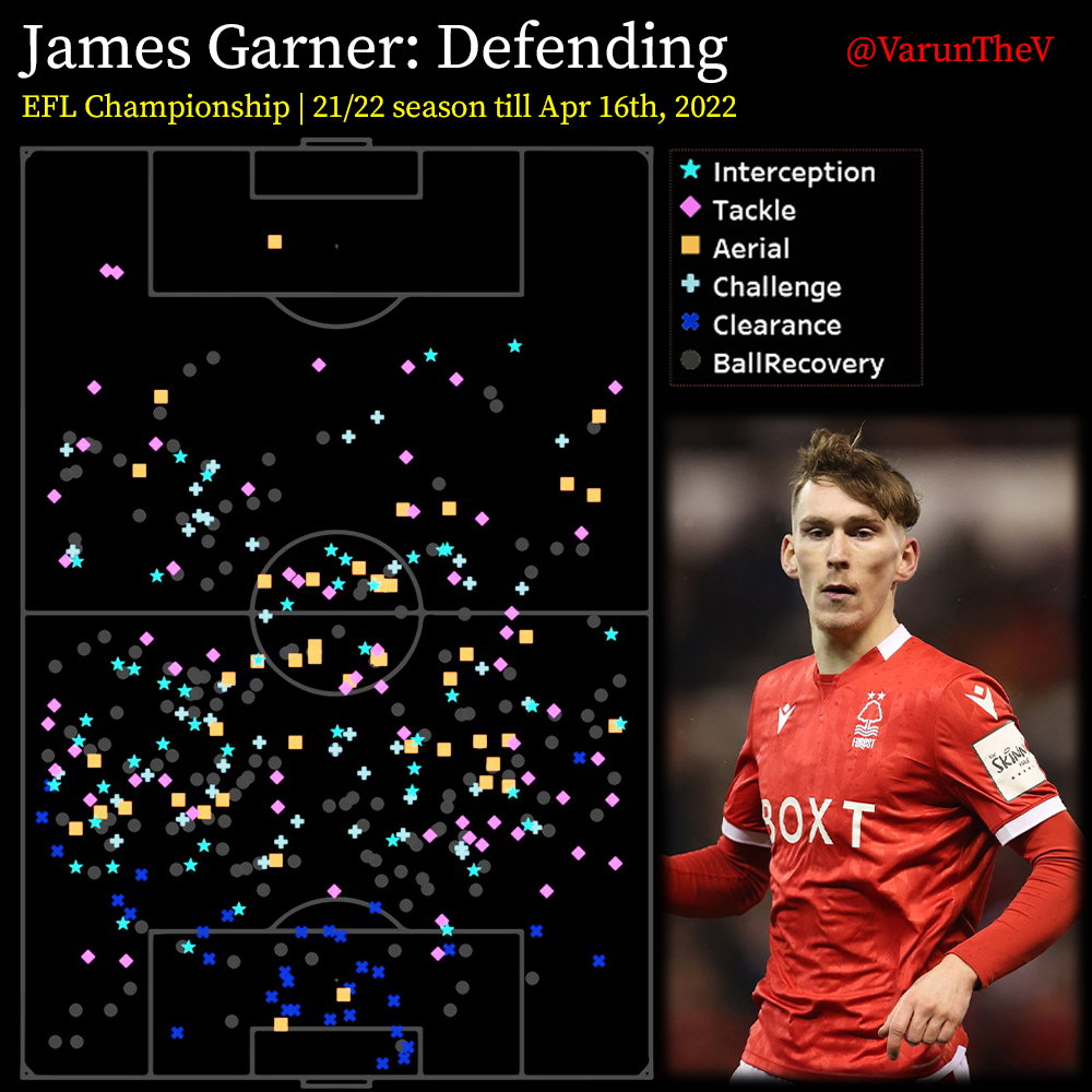 The best word to describe Garner’s defending is intense. His constant running isn’t limited to when his team has the ball. He puts in a hard shift when his team doesn’t. What’s particularly impressive is the number of recoveries and the spread of them. Garner is constantly picking up second balls across the pitch. He has a host of clearances in his box and many aerial wins outside the box as well showing one area of his game that has improved massively – his physicality. He’s not shy to get into an aerial duel anymore.
