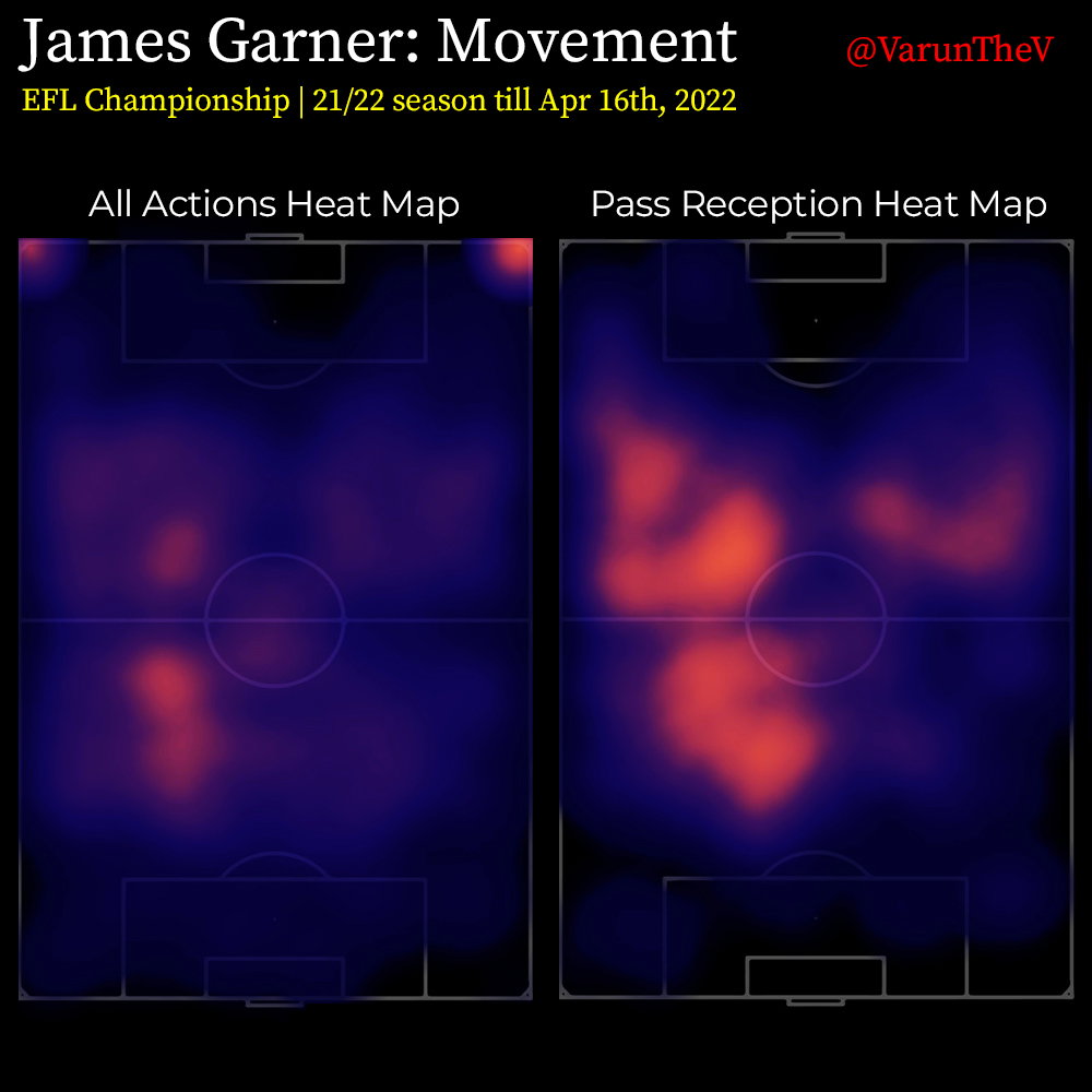 In summary, Garner’s movement indicates how he doesn’t sit or hold in midfield but loves to run all over the pitch. This includes build up receptions in his half and almost AM-style wide and high receptions during attack. If we had to assign a name to this role, it would be – Box-to-box midfielder.
