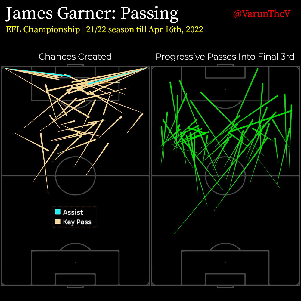 This once again ties in well with our theme of Garner being a box-to-box midfielder who prefers to open up the game and help his team advance rather than progress from deep and help build up. His set piece threat and creativity in the final third from a left-leaning angle are his main chance creation weapons.