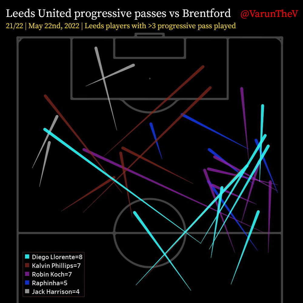 There were a mammoth 47 progressive passes played as a team, which is Leeds 5th-highest this season, showcasing how well they passed through Brentford with purpose and vision. Centre-back Llorente was the pick of the bunch boasting 8 progressive passes in the game, constantly carving through the left-side of Brentford with his aggressive passing. Phillips had another passing display to be proud off, as he spread the game from his central role, finding offensive players regularly on either side. Koch and Raphinha had another good outing on the right flank, both combining regularly to advance the game from the first phase to the second and second phase to third. Koch was especially impressive, bagging 7 progressive passes, many of which were cross-balls towards the centre of the pitch to find players other than Raphinha as well. Harrison rounded up the top progressors with some good advancement on the left flank to add to his well-taken goal. Overall, it was a penetrative passing performance that was much needed in a must-win game.