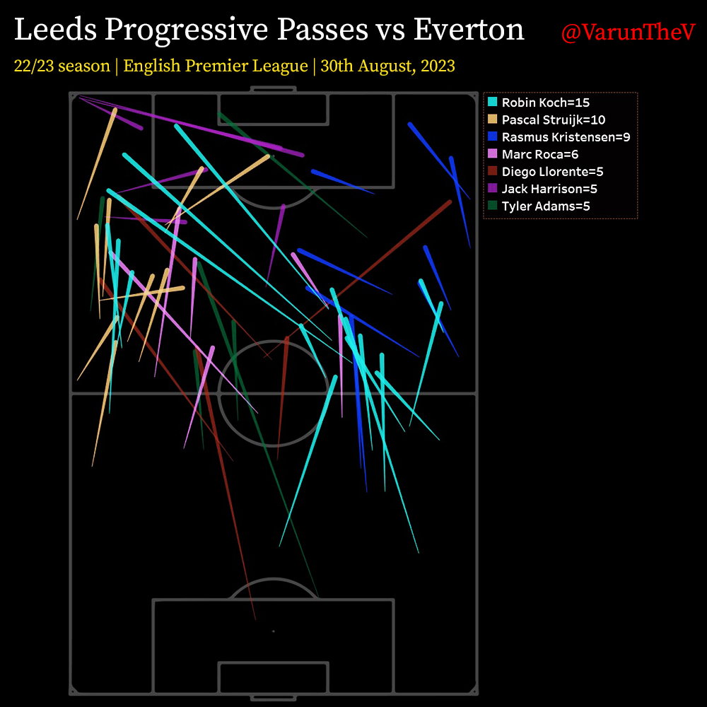 Everton’s deep 4-5-1 block meant that Leeds had a lot of time and space to progress. The defenders especially, were able to play higher up the pitch and seek more ambitious inroads than a usual Premier League game. As a result, we saw Robin Koch get a game-high 15 progressive passes, which also happens to be this season’s highest in a game for a Leeds player. The right-sided defender had a great game spreading play across the pitch and pushing his team forward from the back.