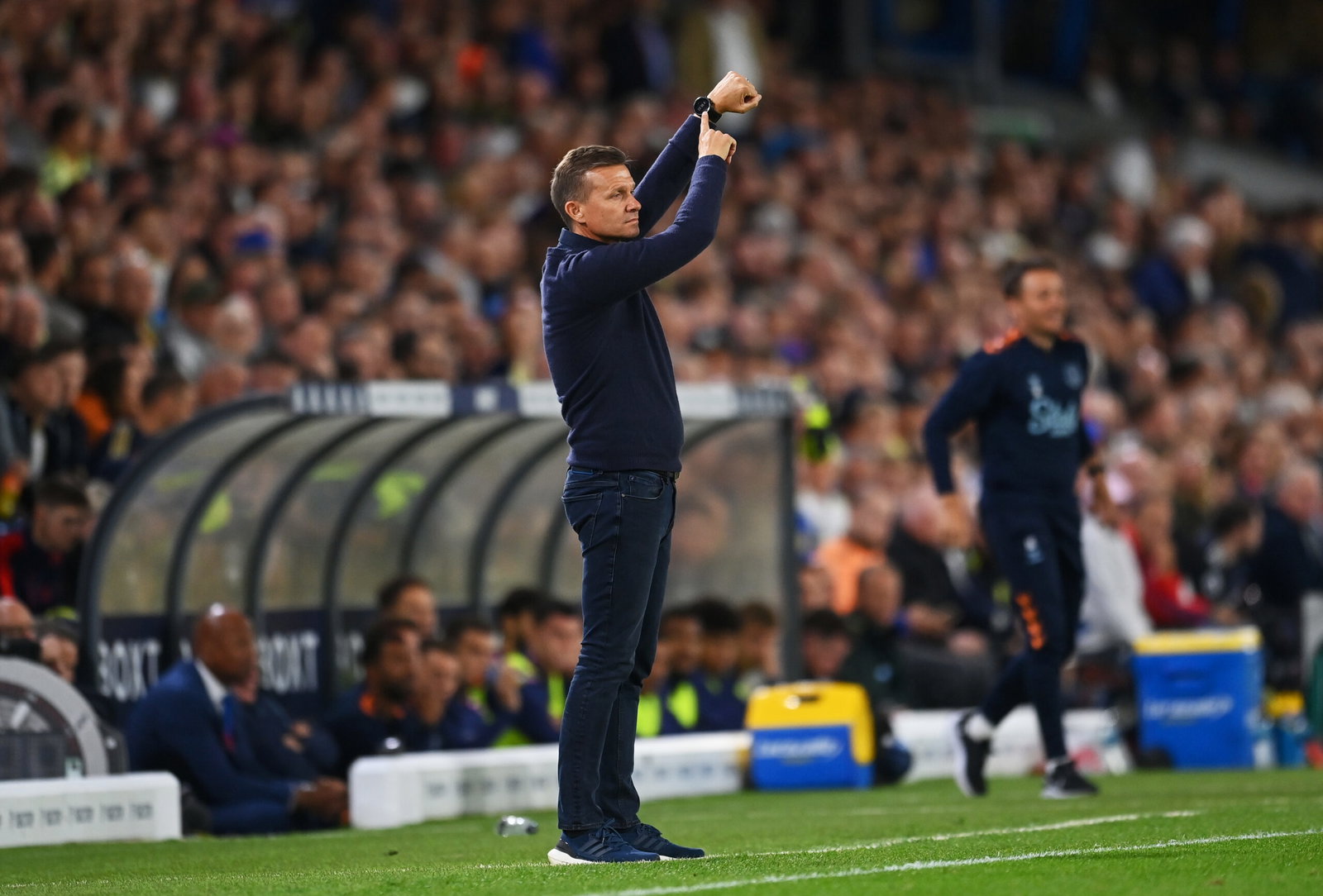 LEEDS, ENGLAND – AUGUST 30: Jesse Marsch, Manager of Leeds United reacts during the Premier League match between Leeds United and Everton FC at Elland Road on August 30, 2022 in Leeds, England. (Photo by Michael Regan/Getty Images)