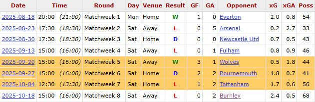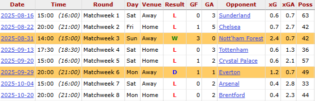 West Ham form Credit: FBref