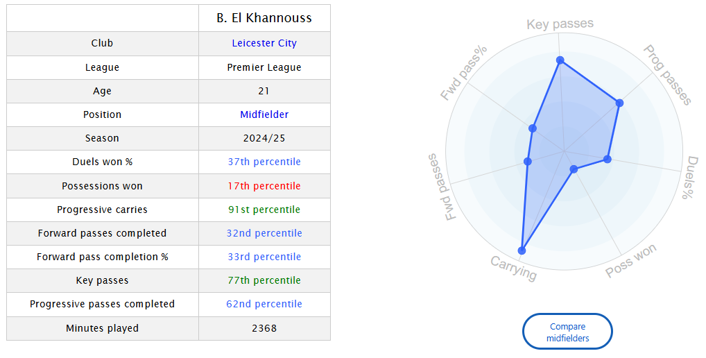 He was very good at carrying the ball, and creating chances, but it seemed his teammates were not on his wavelength. Jamie Vardy, who was Leicester captain last year, has said that El Khannouss is a very good player.